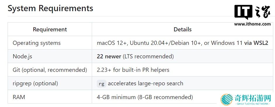 Codex CLI 可以在 macOS12+、Ubuntu20.04+/Debian10+、Windows11 的 WSL2 子系统中使用,要求最少拥有 4GB 内存(建议 8GB)。