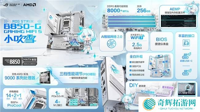 为了让玩家能够尽情享受这次试玩活动,我们特别为打算打造专属电竞主机的玩家推荐了三款华硕B850主板。首先,华硕ROG B850小吹雪主板以其突破性的设计,重塑了电竞美学。这款主板是AMD平台首款吹雪小板,银白装甲搭配白色内存插槽和浅色PCB,再辅以支持神光同步的ROG LOGO,树立了次元美学的新标杆。其14+2+1供电模组和双8Pin ProCool供电接口,确保了可以轻松驾驭AMD锐龙9000系列处理器。同时,其丰富的接口设计、强大的网络性能以及BIOS便捷仪表盘等特性,都为玩家提供了极佳的使用体验。
