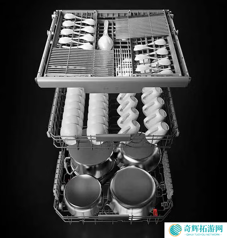产品内部一次可容纳 130 件餐具,三层碗篮配备两侧红酒杯托。变频排水泵净排洗涤残水,三重滤网分化残渣。科学定时巡航抑菌,保持腔内干爽。新品精准检测碗碟污渍程度,智能适配洗涤时长,自动精准投放洗碗液,一次加满可用 3 周。