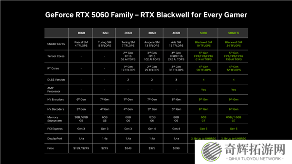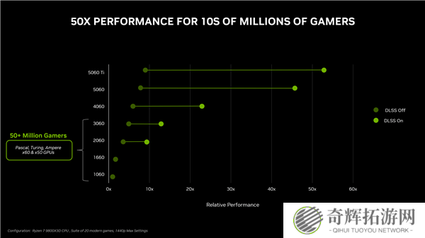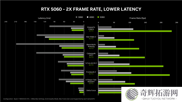 从RTX 5060 Ti的官方性能数据来看,其在性能和延迟方面均表现出色。而与历代x60系列显卡相比,RTX 5060 Ti的性能提升主要得益于DLSS技术的加持。这一技术的引入,不仅提升了显卡的性能表现,更为玩家带来了更为流畅的游戏体验。