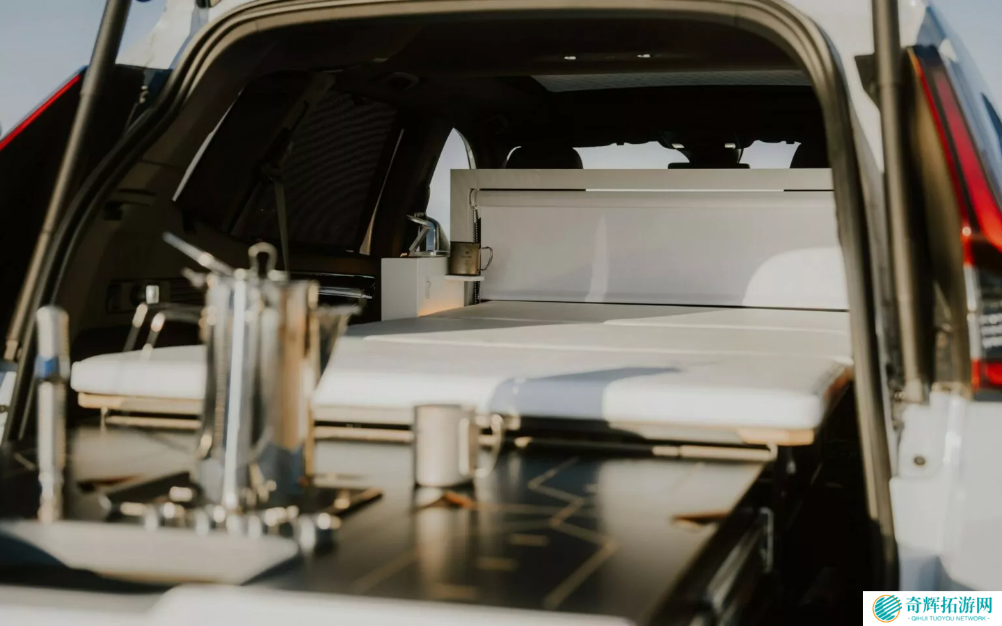 该车货厢内安装了 EGOE Nestboard 650 套件,展开后可展现出一张双人床垫,供两名成年人使用。休息时,车主可以安装后窗百叶窗,并拉下位于前座后方的可收缩窗帘,营造私密空间。