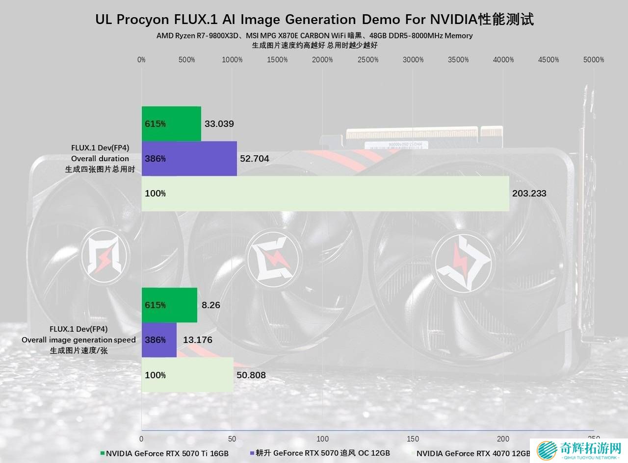 在AI性能测试中,耕升GeForce RTX 5070追风OC同样表现出色。其支持FP4精度模型加速处理,相比上一代显卡在AI图像生成和文本生成任务中均有显著提升。例如,在UL Procyon的FLUX.1 AI Image Generation Demo测试中,其生成一张图片的时间仅为13.176秒,而上一代显卡则需要50秒以上。