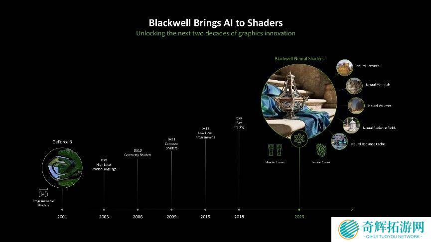 Blackwell架构还首次支持GDDR7显存,数据传输速率可达GDDR6的两倍,功耗却接近GDDR6的一半。神经网络着色器的引入更是彻底改变了GPU的着色方式,通过神经网络纹理压缩、材质、体积、辐射场和辐射缓存等技术,实现了更高效的材质渲染和更逼真的视觉效果。