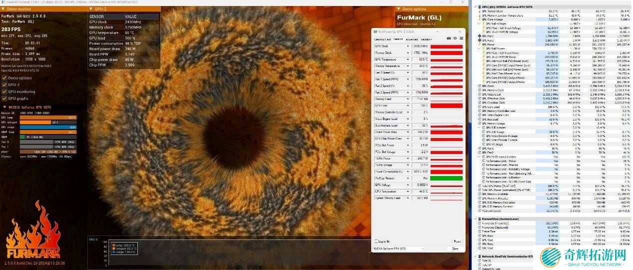最后,在功耗与温度测试中,耕升GeForce RTX 5070追风OC表现出色。在Furmark烤机测试中,满载10分钟后GPU核心温度仅为65.5度,显存温度为54度,功耗为246.2W。相比上一代显卡,其在保持高性能的同时,温度控制更加出色。