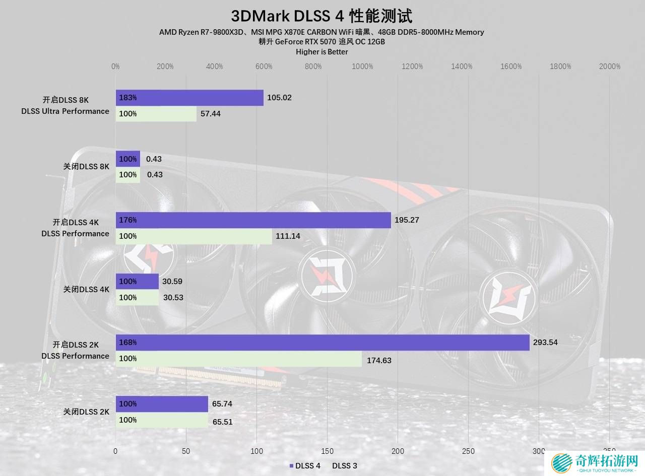 DLSS 4是RTX 50系列显卡的一大亮点。相比DLSS 3,DLSS 4引入了多帧生成技术,最多可生成3帧额外帧,实现高达8倍的性能提升。同时,DLSS 4还引入了Transformer模型,提供更高的稳定性和细节表现。在实际测试中,耕升GeForce RTX 5070追风OC在DLSS 4加持下,性能提升显著,甚至能够在8K分辨率下流畅运行游戏。
