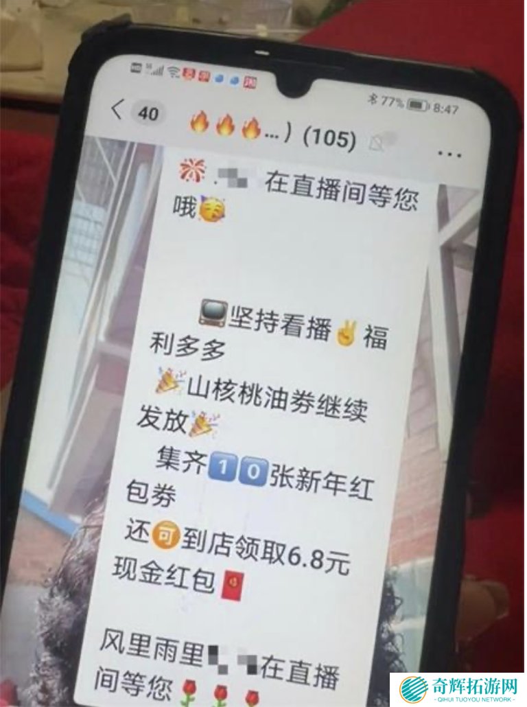 刘鹏出示的群聊截图显示,这个名为“富民路店长服务(2 群)”的群有 105 名成员,群聊十分活跃。管理员不时发布“坚持看播,福利多多”“山核桃油券继续发放”“还可到店领取 6.8 元现金红包”等信息。开播前,管理员会发红包,标注开播时间。相应“兑换券”通常在直播开始、中间、结尾 3 个时段发放,要领到券得全看完。