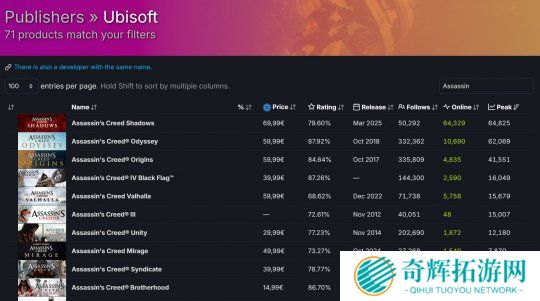 SteamDB官推宣布,《刺客信条:影》Steam在线峰值达到64825人,终于超过2018年游戏《刺客信条:奥德赛》(62069人),正式成为该系列在Steam平台在线峰值最高的一作。
