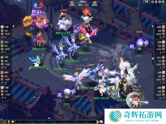 进入比赛后,【展翅飞翔】(观战方)采用了“女儿、地府、双九黎、女魃”组成的“点杀”体系,【看图说话】(对战方)则是选用了“双九黎、普陀、女儿、天宫”组成的“双封”阵容。就阵容体系来说,【展翅飞翔】的阵容拥有极强的输出能力和清宠能力,【看图说话】拥有较强的控制能力。