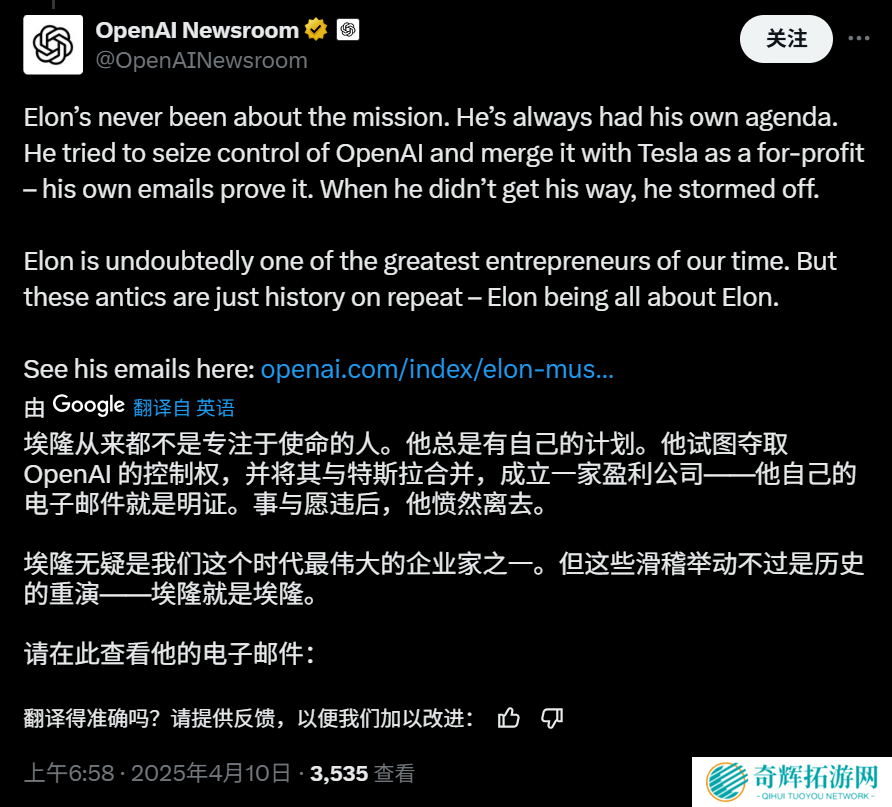 本站注意到,OpenAI还称,“埃隆从来都不是专注于使命的人,他总是有自己的计划。他试图夺取 OpenAI 的控制权,并将其与特斯拉合并,成立一家盈利公司 —— 他自己的电子邮件就是明证。事与愿违后,他愤然离去。埃隆无疑是我们这个时代最伟大的企业家之一。但这些滑稽举动不过是历史的重演 —— 埃隆就是埃隆。”