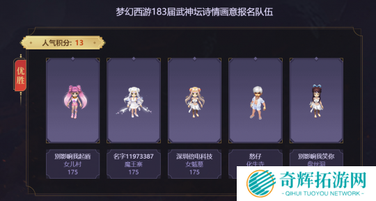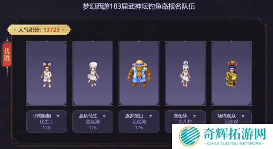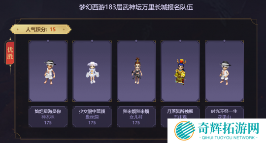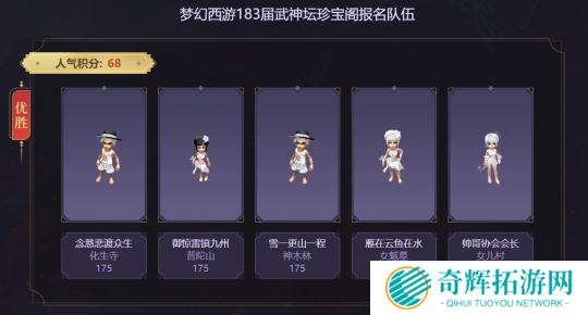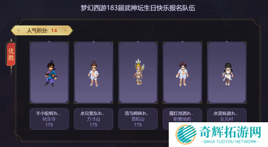 西栅老街自上届武神坛夺冠后,团队老板又开启了“大力”更新模式。先不说“熊无敌”、“伦总”等老板的硬件实力,西栅老街最近的更新重点基本都在围绕“净台”童子。从上届武神坛就可以看出,“净台”童子的血量的经常破万,只要神一下就会令对手非常头疼。如今,酸奶等等老板的女魃墓正式回归,西栅老街起飞势头恐无法阻挡。