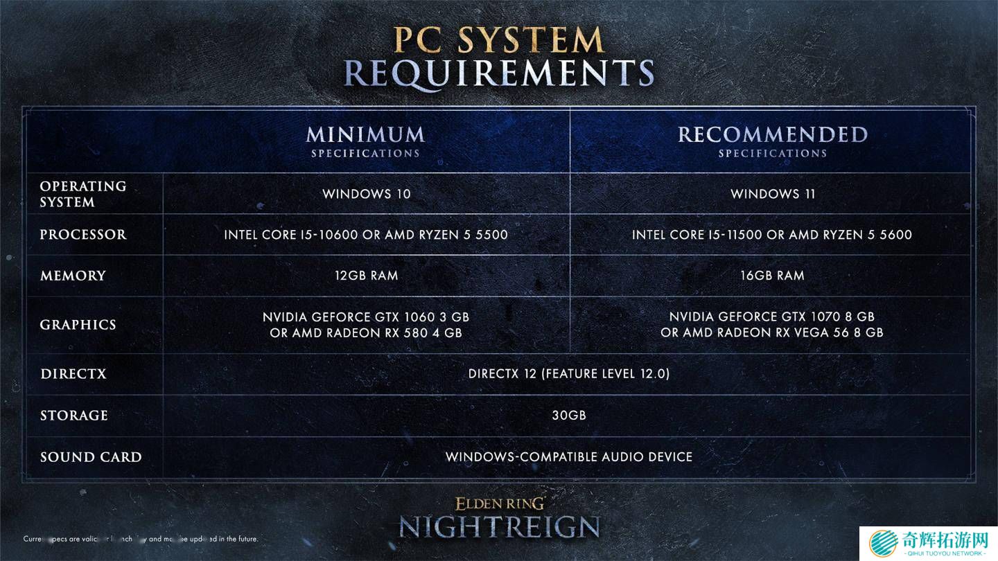 目前,《艾尔登法环:黑夜君临》已在Steam平台开启预购,国区标准版售价为198元,而数字豪华版则为268元。From Software还公布了该作的PC配置要求,为玩家提供了明确的参考。最低配置需求包括Windows 10系统、Intel Core i5-10600或AMD Ryzen 5 5500处理器、12GB内存以及NVIDIA GeForce GTX 1060 3GB或AMD Radeon RX 580 4GB显卡。而推荐配置则要求Windows 11系统、Intel Core i5-11500或AMD Ryzen 5 5600处理器、16GB内存及NVIDIA GeForce GTX 1070 8GB或AMD Radeon RX Vega 56 8GB显卡,并预留30GB硬盘空间。