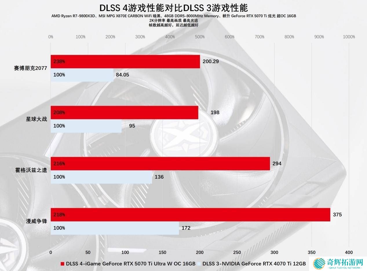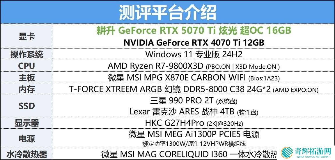 除了硬件规格的提升,RTX 50系列还引入了DLSS 4等领先技术。在性能测试中,我们采用了锐龙7 9800X3D处理器、微星MSI MPG X870E CARBON Wi-Fi主板以及芝奇Trident Z5 RGB内存等高端硬件,以确保测试结果的准确性。测试结果显示,耕升RTX 5070 Ti 炫光 超OC在2K分辨率下,相较于RTX 4070 Ti,性能提升显著,多数游戏平均帧率超过100FPS,部分游戏甚至达到300 FPS以上。
