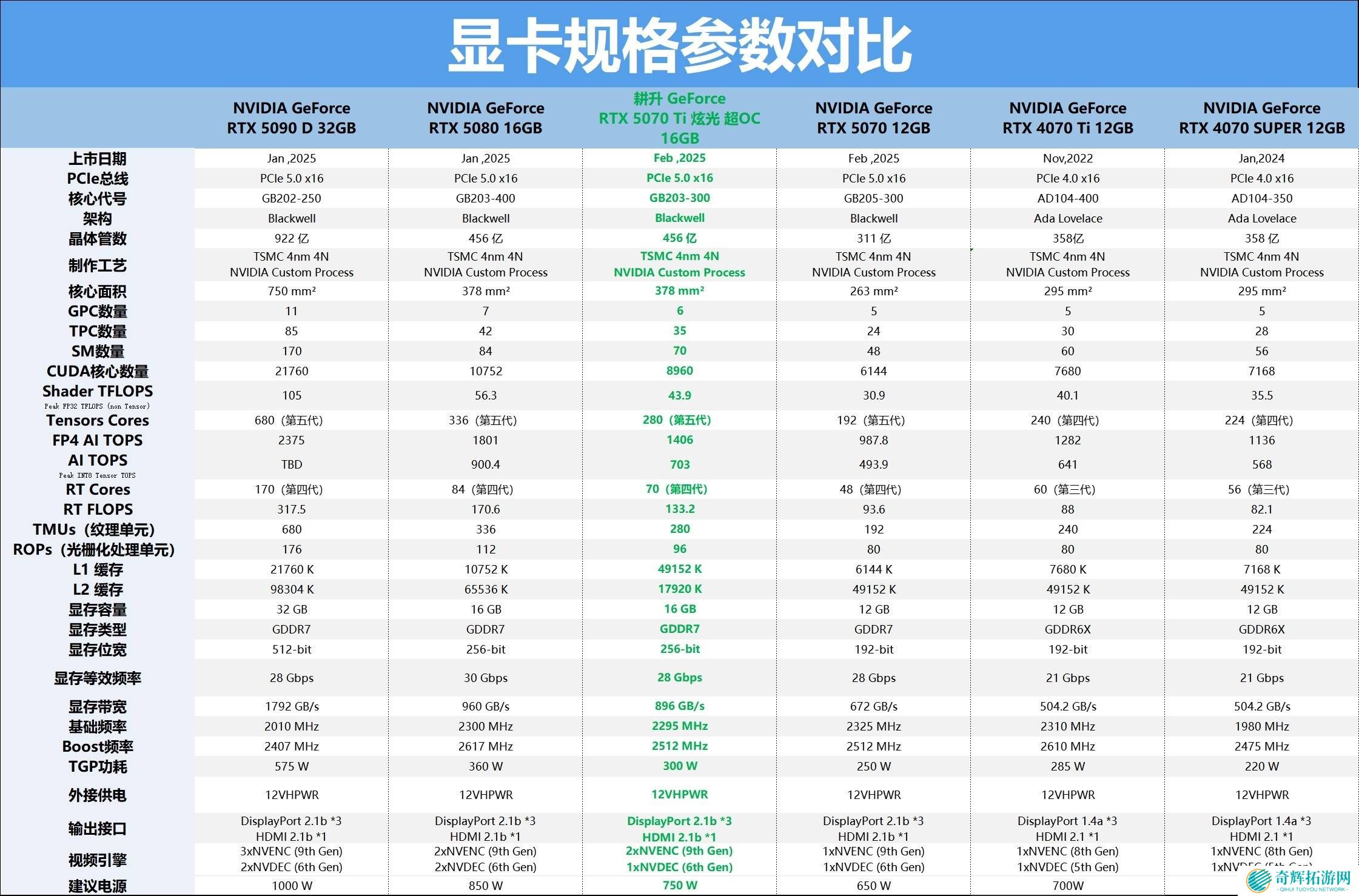 耕升RTX 5070 Ti 炫光 超OC基于Blackwell架构打造,采用台积电4nm 4N NVIDIA定制工艺。其核心包括CUDA数量、第四代RT Core以及第五代Tensor Core,这些核心共同组成了新一代的SM单元。这款显卡拥有高达2512 MHz的加速频率,并配备了16GB的GDDR7显存,显存位宽为256-bit,显存带宽达到896GB/s。在规格上,相比前代产品有了显著提升。