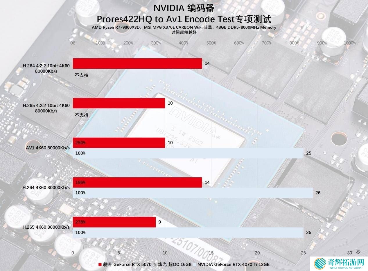 除了游戏性能,耕升RTX 5070 Ti 炫光 超OC在内容创作方面也有不俗表现。其内置的第九代NVENC编码器支持H.264/H.265 4:2:2编码,且双NVENC设计使得编码效率更高。在视频导出测试中,耕升RTX 5070 Ti 炫光 超OC相比RTX 4070 Ti节省了近一半的时间,特别是在导出AV1格式视频时,效率提升尤为显著。