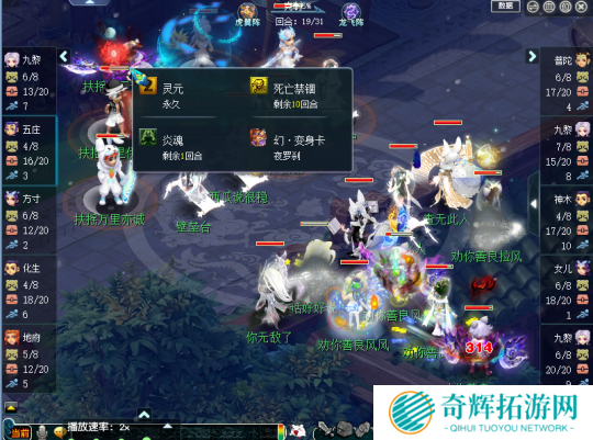 切入战斗,及时行乐鹰阵国标小克了我跟你说的虎阵咒法点杀,及时行乐拿到了全场一速和输出速度,第6回合,我跟你说发起点杀,咒师日光华砸掉及时行乐神木6000血,但是血条却连一半都没到,神木也被封住导致点杀失败,可见及时行乐的属性非常针对,我跟你说想要点杀难度很高。