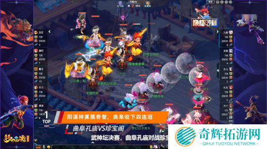 第36回合,曲阜孔庙凭借出色的控制能力和九黎城的输出,将珍宝阁女儿、魔王压倒。然而,曲阜孔庙的决胜谛听被珍宝阁凌波城点掉,进攻节奏被成功打断。 第45回合,曲阜孔庙再度发力,以一波面伤再度压制珍宝阁女儿村。此时的珍宝阁召唤兽数量少,药品也所剩无几。比赛后期,曲阜孔庙靠着九黎城再度打出面伤压制,将珍宝阁逼入绝境。 第49回合,曲阜孔庙以一波极致面伤几乎将珍宝阁全员压倒。随后,凭借九黎城完成清场,成功拿下比赛。这场比赛双方你来我往,战况激烈,曲阜孔庙凭借出色的发挥和战术策略获得了胜利。