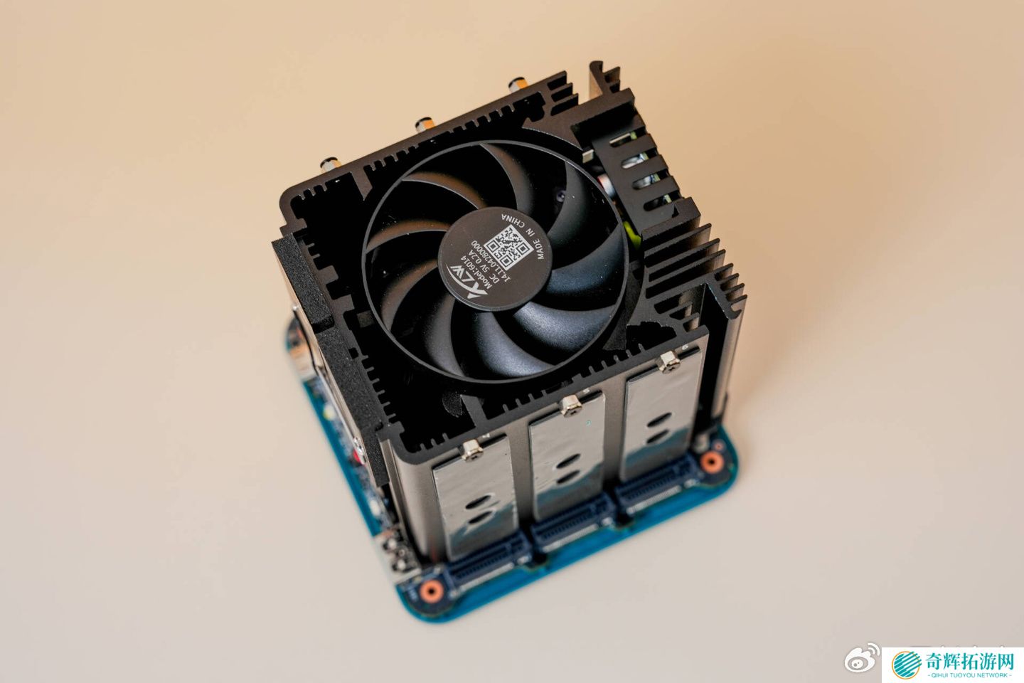 从图中可以看出,这款机型采用顶部散热,配备静音风扇及一体散热片,风扇下面是一根压在 CPU 上的金属柱,与外面的散热鳍片相连。