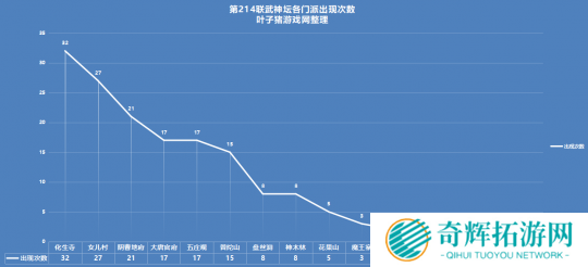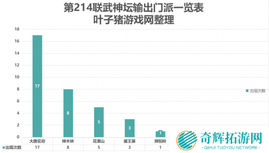 本届武神坛中,输出门派出现了8个,其中大唐官府的出场次数为17,神木林的出场次数为8,花果山的出场次数为5。其余输出门派虽然没有显著增加,但已经呈现出“百花齐放”的局面。