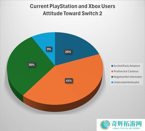 报告进一步指出,Switch 2在竞争激烈的市场格局中正展现出与PlayStation和Xbox比肩的竞争力。用户调研数据显示,61%的主机玩家对Switch 2持正面看法,其中20%的玩家表示“非常期待并将立即购买”,而41%的玩家则持“积极但谨慎”的态度。