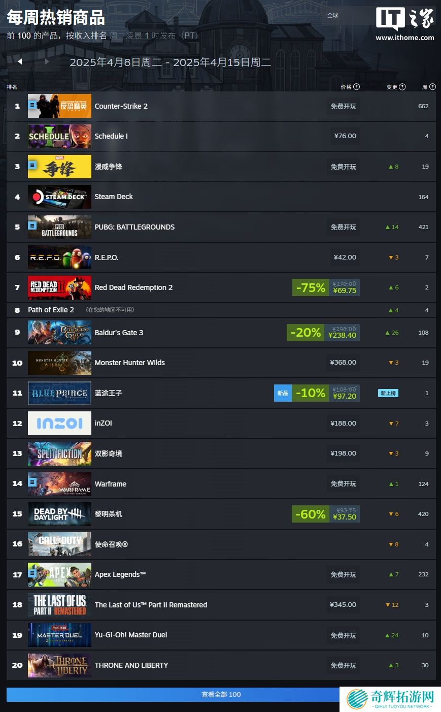 本站 4 月 15 日消息,Valve 刚刚公布了 Steam 最新一周游戏销量排行榜,第一人称模拟游戏《Schedule I》全球三连冠,在线合作恐怖游戏《R.E.P.O.》延续第二名,《荒野大镖客 2》冲进前三。