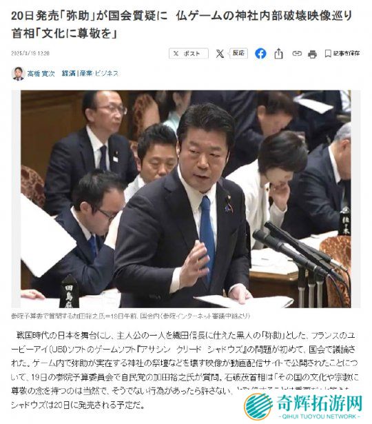 19日的参议院预算委员会上,自民党议员加田裕之针对游戏主角之一的弥助,破坏真实存在的神社祭坛画面提出质询。首相石破茂回应称:“对一国文化与宗教保持尊重是理所当然的,必须明确反对任何不敬行为。”