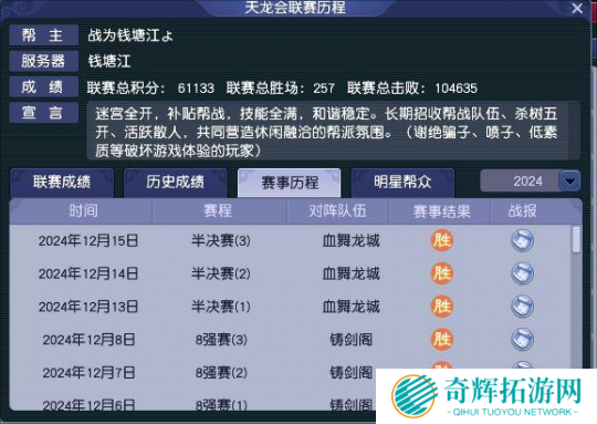 天龙会先后击败了权倾天下(年度积分排名59)、缔造神话(年度积分排名50)、中华英雄阁(年度积分排名62)、铸剑阁(年度积分排名35)、和血舞龙城(年度积分排名6)五大帮派,以全胜的姿态晋级。