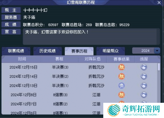 幻雪阁先后击败了五气狂龙殿(年度积分排名63)、ぁ飘然居お(年度积分排名12)、聚义山庄(年度积分排名4)、江湖(年度积分排名13)、和折戟沉沙(年度积分排名3)五大帮派,在刚刚结束的半决赛中,幻雪阁和折戟沉沙进行了势均力敌的较量,最终以顽强的斗志,让一追二拿下比赛,铸造了今年最精彩的对决之一。