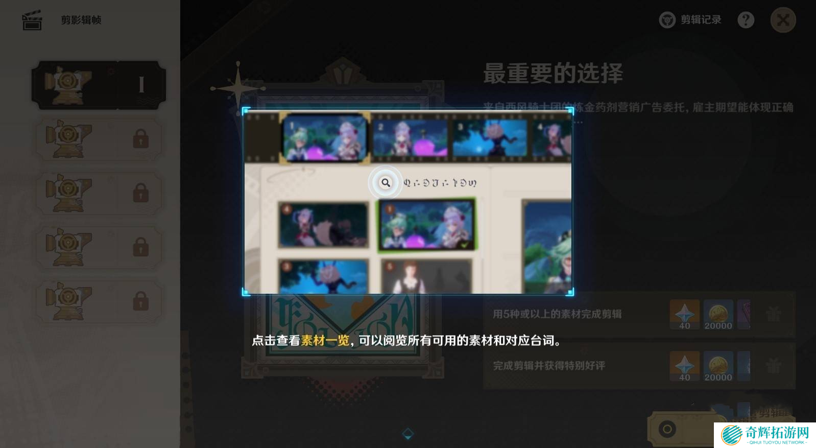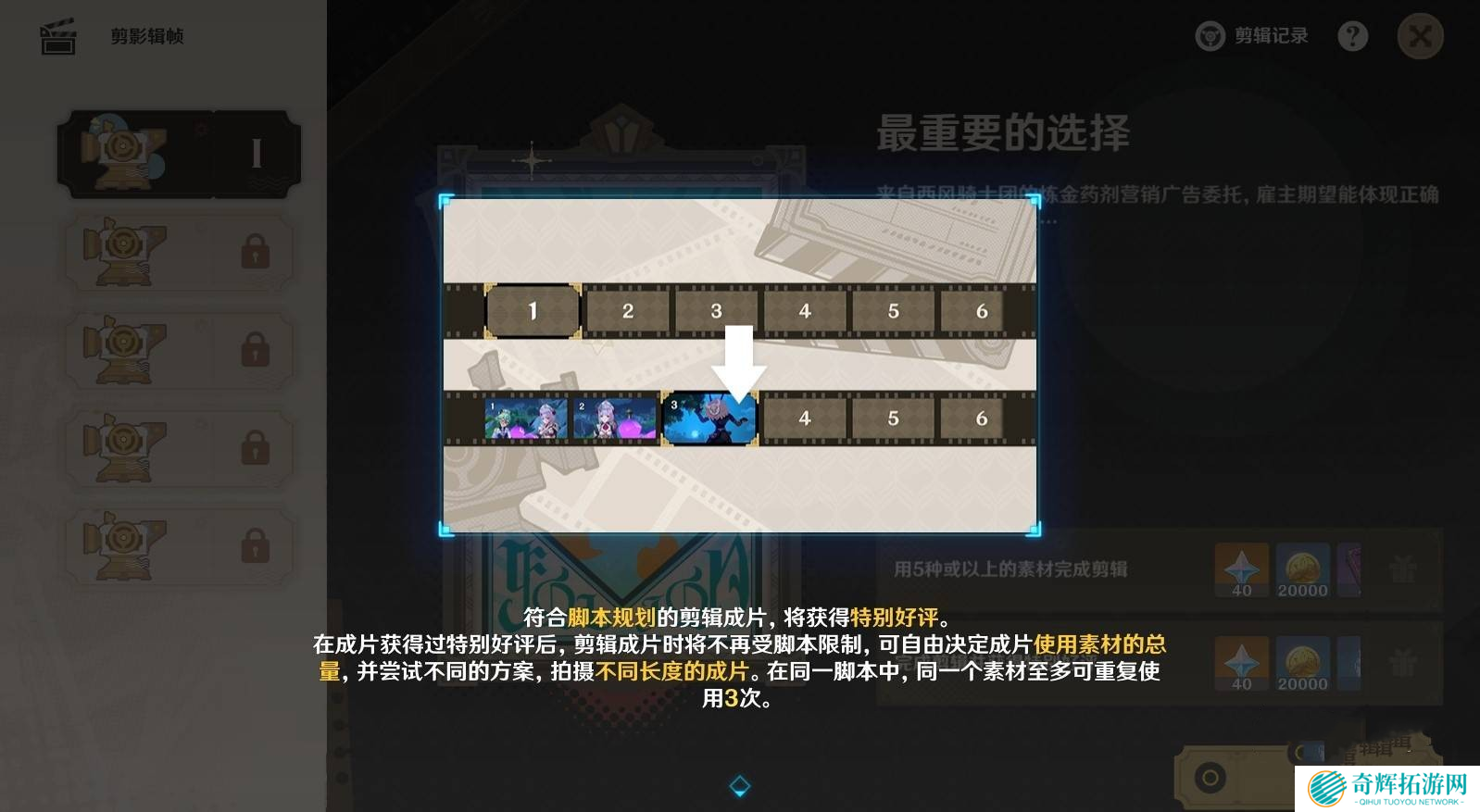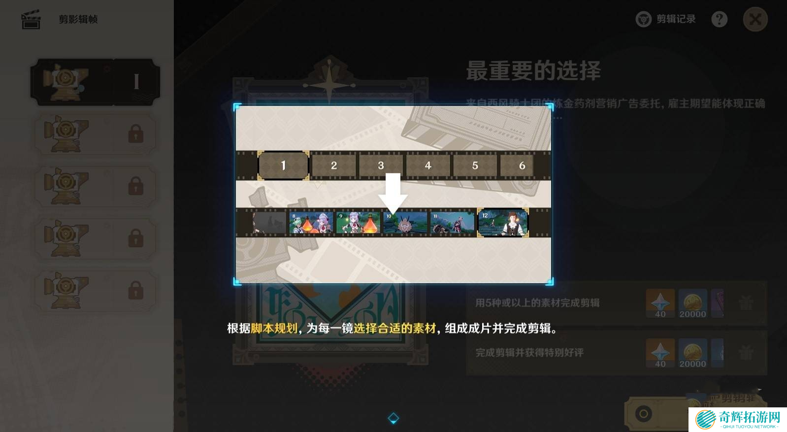 旅行者需根据活动提供的脚本选择合适的镜头素材进行剪辑。