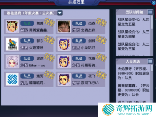 扶摇万里的报名阵容为:普陀、地府、无底、五庄、九黎、九黎、女儿、神木。