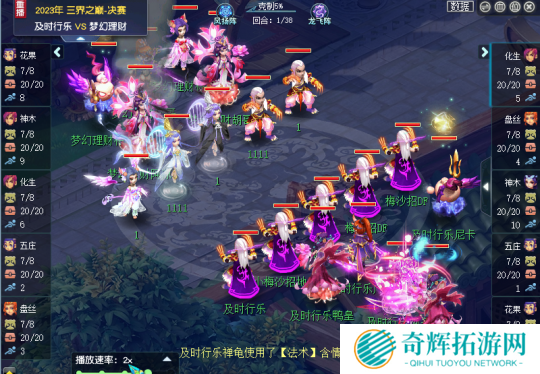 切入战斗,双方均为双封物法阵容,及时行乐龙飞阵小克了梦幻理财的风扬阵并且拿到了全场14速,开场第一回合,及时行乐就将梦幻理财花果山套住,并且物理配合法系集火点杀将其击倒,拖延了其野兽的节奏。