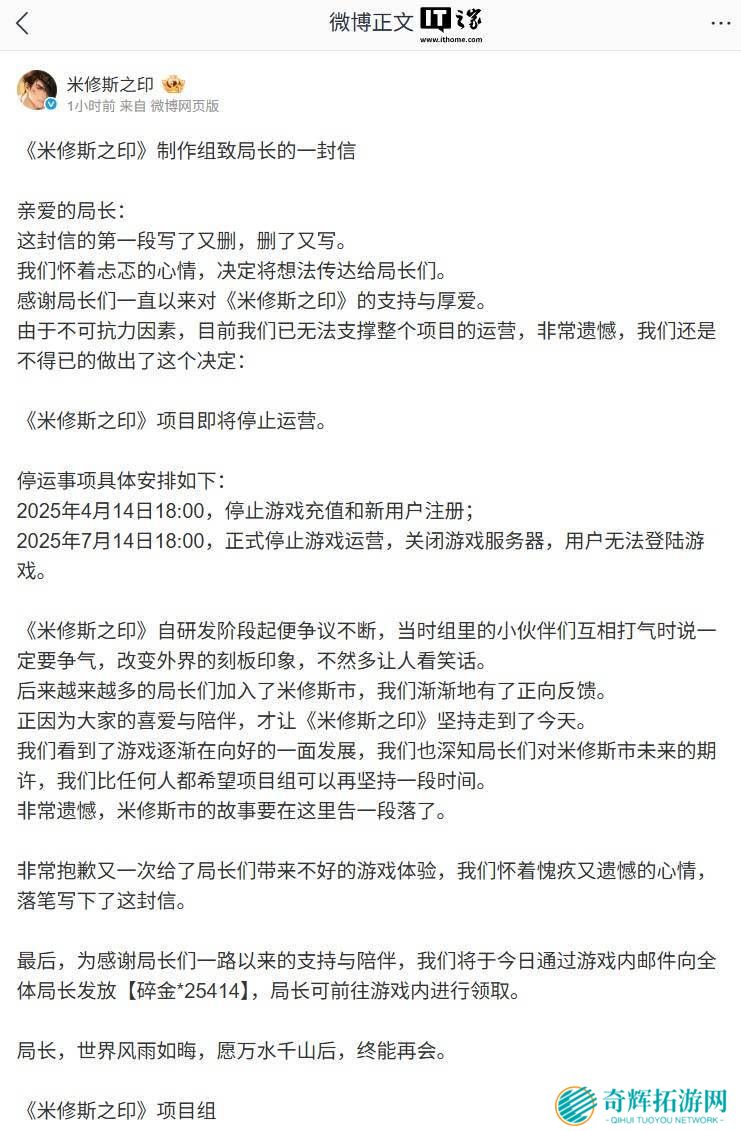 根据官方发布的通知,这一决定源于不可抗力因素,使得项目团队无法继续支撑其运营。因此,他们怀着沉重的心情,做出了停止《米修斯之印》运营的决定。具体安排为,自今日18时起,游戏将停止充值服务及新用户注册;而到了今年7月14日18时,游戏将正式关闭服务器,届时玩家将无法再登录游戏。