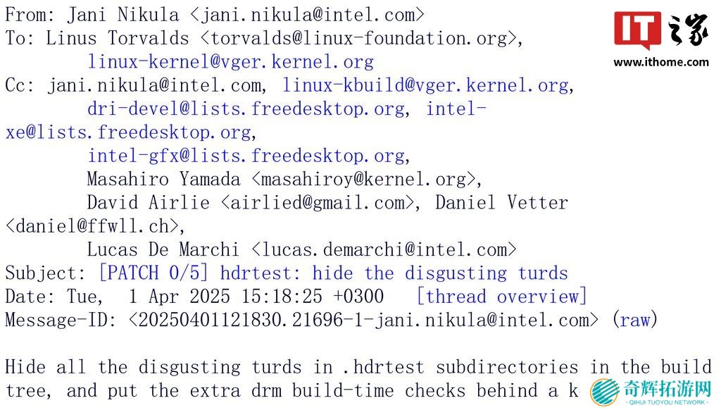 Nikula 在回应中承诺将测试文件移至.hdrtest 子目录,并通过 kconfig 选项隔离额外检查项。这场技术交锋展现了 Linux 社区对代码质量的严苛要求。