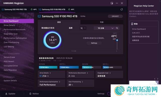 三星还提供了SAMSUNG Magician软件,让用户随时了解存储设备的健康状态并进行原厂级维护。该软件支持性能测试、性能模式设置、数据迁移和安全擦除等功能。