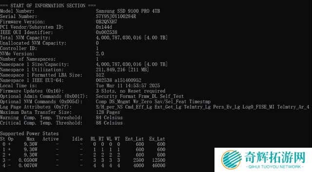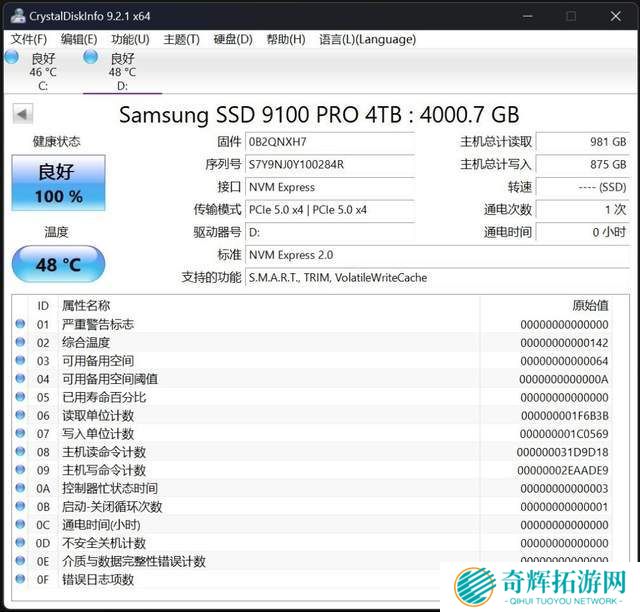 通过Crystal Disk info,我们可以看到三星9100 PRO标准版4TB的可用容量为4000.7GB,传输模式为PCIe 5.0x4,支持NVMe 2.0标准,以及S.M.A.R.T、TRIM和VolatileWriteCache功能。VolatileWriteCache是NVMe协议中的一个特性,通过暂存数据减少延迟并提高写入速度。