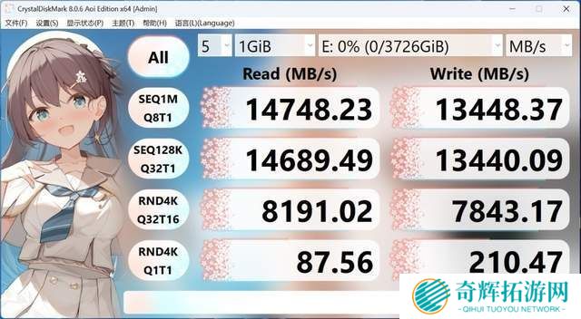 在基准测试中,三星9100 PRO 4TB的连续读取速度高达14748.23MB/s和13448.37MB/s,接近标称值,达到了“满血”PCIe 5.0水准。其顺序读写性能相比上代旗舰产品990 PRO近乎翻倍。