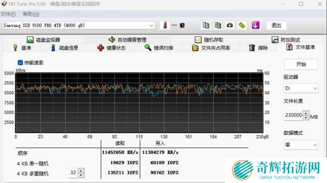 在随机性能测试中,三星9100 PRO 4TB的4K随机性能达到2000K IOPS和1915K IOPS,可大幅提升系统响应和应用/游戏加载速度。三星特有的TurboWrite 2.0技术大幅提升了SLC缓存空间,在HD Tune Pro的文件基准测试中,SLC缓存大于设定的230GB。