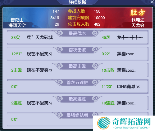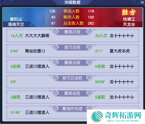 从赛后数据来看,虽然【天龙会】一方参战人员依然少于【海阔天空】,但由于硬实力的原因,依然拿到较大的击败优势。不过,【海阔天空】的成员并不弱,他们在重整旗鼓之后,也拿到了159个击败。