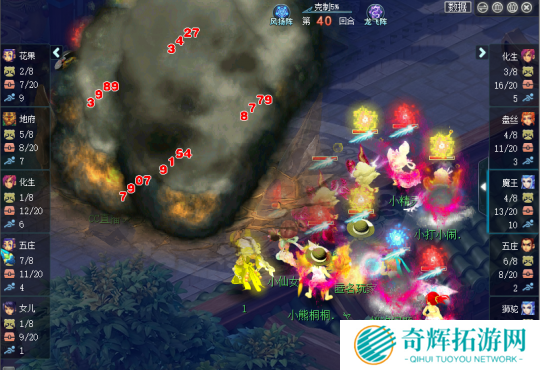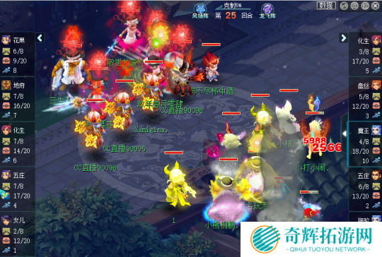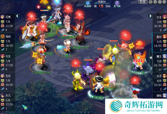16回合,珍宝阁趁胜追击,小死亡配合高伤力劈点杀钓鱼岛魔王,同时攻宝宝补刀,但是钓鱼岛魔王运气逆天,连续触发3个163存活下来,17回合反手暴死一记秘传飞沙走石暴死了珍宝阁的花果山。