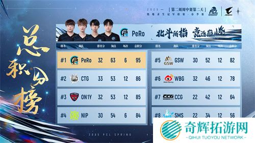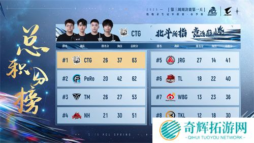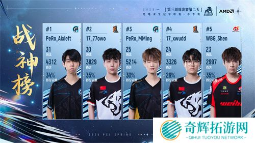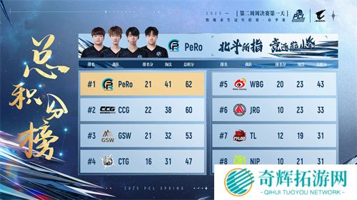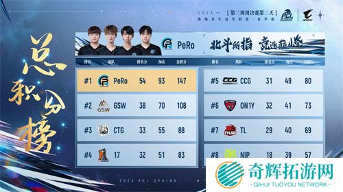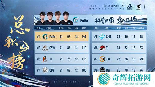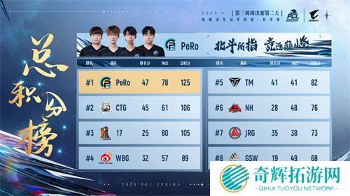 本轮周决赛后,PeRo、GSW、CTG三支战队位列前三,PeRo更是以85000总奖金拿到赏金榜榜首,其队员Aixleft也以33淘汰和5846的总伤获得战神榜榜首的好成绩。