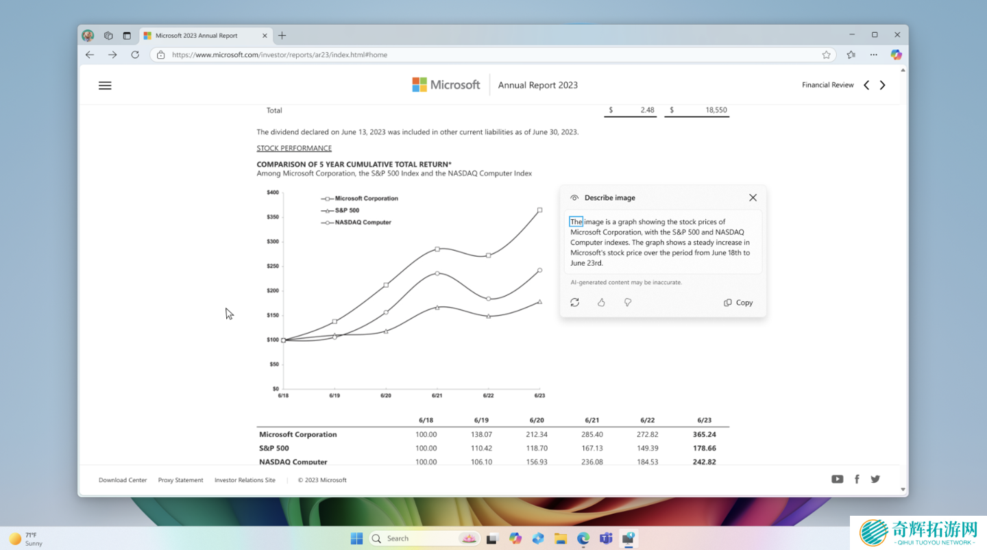 微软强化了图像描述功能(Narrator),现在 Copilot+ PC支持读出各种图片的描述,帮助障碍人群了解图片中到底有什么东西。例如对于一张展示股票表现的图表,用户将得到如下详细描述“图表展示了微软公司的股票价格,同时包含S&P 500及NASDAQ电脑指数,该图表显示从6月18日至6月23日间微软股票价格的稳步上升”。