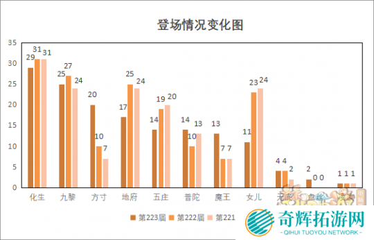 第223届武神坛淘汰赛,仅有11个门派获得了登场机会,参赛门派总数已经连续下滑,可以发现“版本答案”也越来越被大家认可,“弱势”门派也将再难以获得登场机会。其中有3个门派的登场次数超过20次,5个门派的登场次数超过10次,各门派的优先级也逐步清晰。