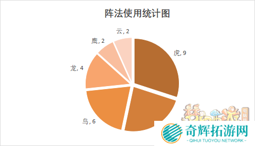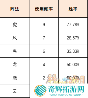 虽然虎翼阵和风扬阵的使用率都极高,但是他们的胜率表现却完全不同。虎翼阵以77.78%的胜率位居所有阵法之首,风扬阵则是仅获得了28.57%的胜率,排在最末。超高的使用率以及登顶的胜率,都让人不得不对虎翼阵产生重视。