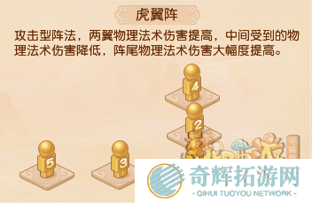 虎翼阵:攻击型阵法,两翼物理法术伤害提高,中间受到的物理法术伤害降低,阵尾物理法术伤害大幅度提高。队长能获得高达30%的物法伤害加成,使得三攻阵容以及双封双辅助阵容与虎翼阵的适配度都极高。