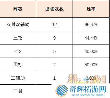 虽然三攻阵容使用频率大幅上升,但是胜率却依然惨淡,仅获得44.44%的胜率。双封双辅助阵容的表现则依然稳定,收获了66.67的胜率,在所有阵容中位居榜首。