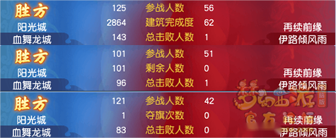 在【血舞龙城】与【伊路倾风雨】的对决中,【血舞龙城】以 3:0 的战绩战胜对手,成功晋级 8 强。这场对决堪称 16 进 8 中战斗烈度最低的三场之一,在三天的对决中,【伊路倾风雨】的参战人数几乎在 50 人左右,这使得【血舞龙城】几乎不费吹灰之力就拿到了 8 强名额。之后【血舞龙城】会遇到同样轻松取胜的【天下】帮派,旗鼓相当的对手终将相遇,谁能笑到最后,下周即可见分晓!