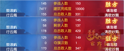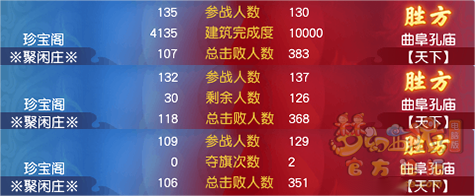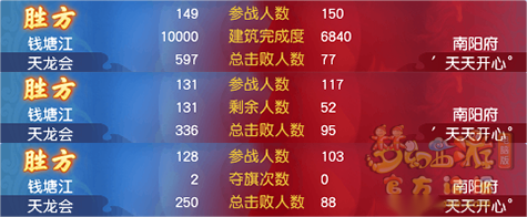 在【天下】与【※聚贤庄※】的激烈对决中,【天下】帮派在三场比赛中均以大幅领先的优势结束战斗。双方都未能动员出较大规模的战力,【天下】可以说是凭借着过硬的实力碾压对手,取得最终胜利。