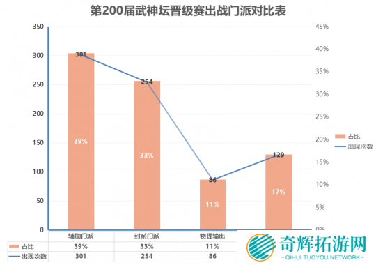 本联出战门派大多数为辅助和封系,这组数据也表明本联武神坛的打法趋近于“四保一”和“五保零”。