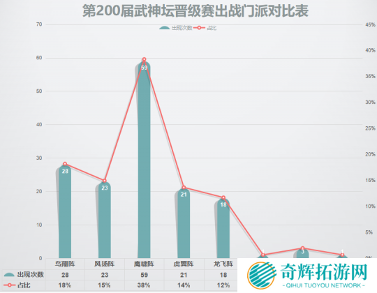 第200联武神坛晋级赛中,鹰阵的出场率一骑绝尘,达到了59场,鸟阵、风阵、虎阵、龙阵次之。这些阵法除了虎阵,均有一定的加速属性。出现这个情况的原因主要和阵容体系有关。