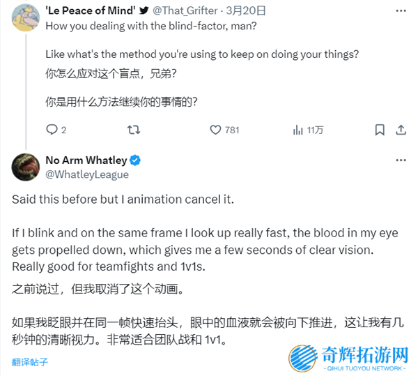 面对如此困境,Whatley并未选择放弃。他深爱着《英雄联盟》,决心重返游戏。通过无数次的尝试与摸索,他自创了一种名为“取消后摇”的技巧。通过快速眨眼并抬头,他能让眼球内的血液流向下方,从而获取短暂的清晰视野。这几秒钟的时间,对他来说至关重要,足以让他观察游戏画面,做出反应。