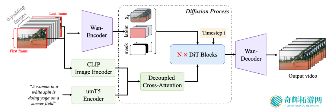 基于现有的 Wan2.1 文生视频基础模型架构,通义万相首尾帧生视频模型进一步引入了额外的条件控制机制,通过该机制可实现流畅且精准的首尾帧变换。